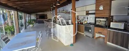 ?A residência conta com uma sala em três ambientes, que proporciona uma excelente distribuição para diferentes áreas de convívio. O piso em granito em toda a casa confere durabilidade e um toque clássico. A área íntima é composta por quatro suítes amplas, todas com armários, sendo que uma delas tem acesso direto à área de lazer. Um escritório e um lavabo completam a conveniência do piso principal.